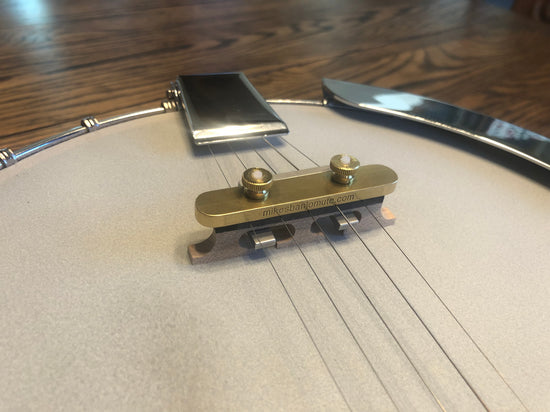 With the nuts loosened, slide the feet of Mike's Banjo Mute between the strings