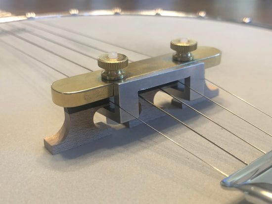 Hold your banjo as you normally would to play. Hold the mute so the brass plate is face up and the aluminum legs point toward the head of the banjo. From the tailpiece side of the bridge slip the aluminum legs between the strings and through the cutouts of the bridge. Tighten screws to hold in place. That's it!